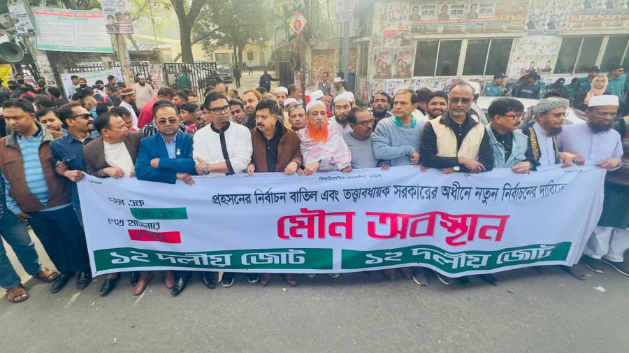 সোমবার (৮ জানুয়ারি) দুপুরে জাতীয় প্রেসক্লাব, পল্টন এলাকায় মৌন মিছিল ও অবস্থান কর্মসূচি শেষে তিনি এ কথা বলেন। ‘প্রহসনের নির্বাচন বাতিল এবং তত্ত্বাবধায়ক সরকারের অধীনে নতুন নির্বাচনের’ দাবিতে এ আয়োজন করে ১২ দলীয় জোট।